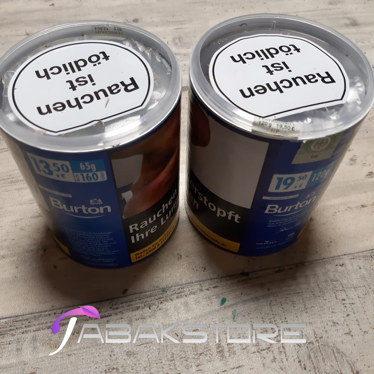 Das hier ist der blaue BURTON-Tabak in 2 Varianten. Die Dosen-Größe ist gleich, nicht aber der Inhalt: links sind es 65 Gramm Volumentabak, rechts 120 Gramm Zigarettentabak. Kurios: die Anzahl der zu erzielenden Zigaretten beim Stopfen soll offiziell annähernd identisch sein, trotz des Preisunterschieds von immerhin 6 Euro. Da sollte man vielleicht einmal genauer hinschauen.