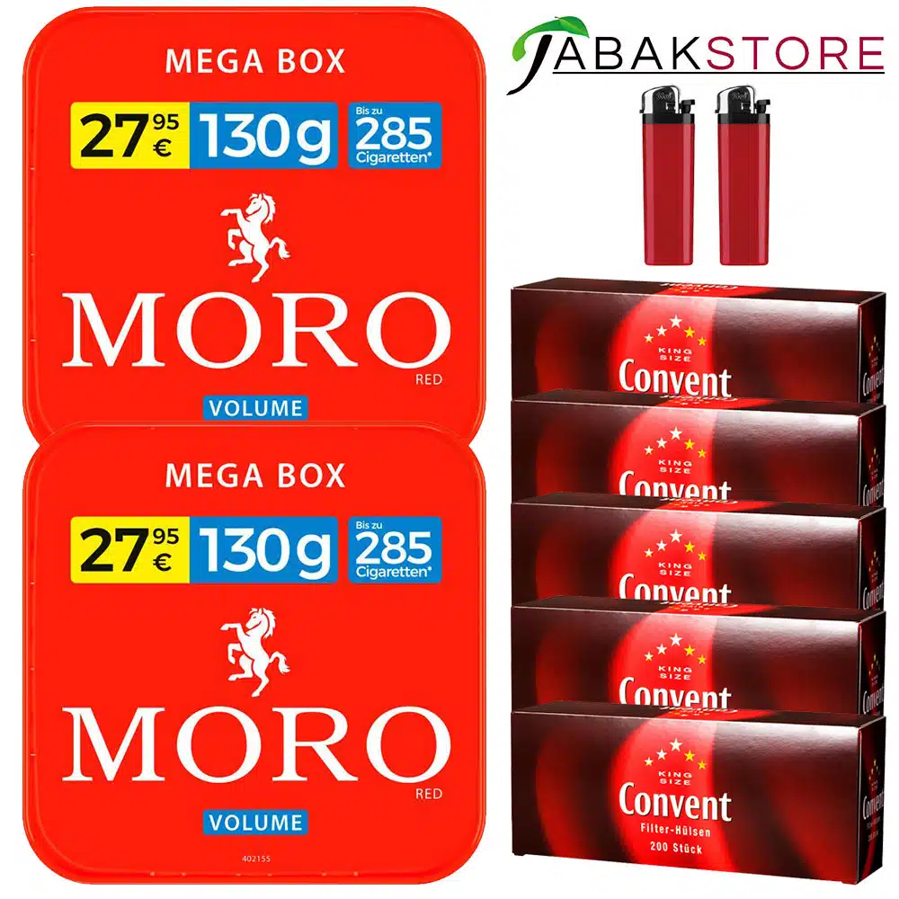 2x Moro Red 130g Tabak | 1000 Convent Hülsen | 2x Feuerzeuge