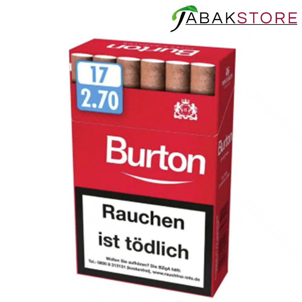 Seit langer Zeit können Sie die Burton Red Zigarillos bei uns im Onlineshop kaufen. Den diese Zigarillo steht nicht nur für ein außergewöhnliches Design sondern auch für ein unverwechselbares Charakter. Burton bleibt jederzeit treu und geht keine Kompromisse ein – insbesondere dann, wenn es um die Qualität Ihrer Produkte geht.