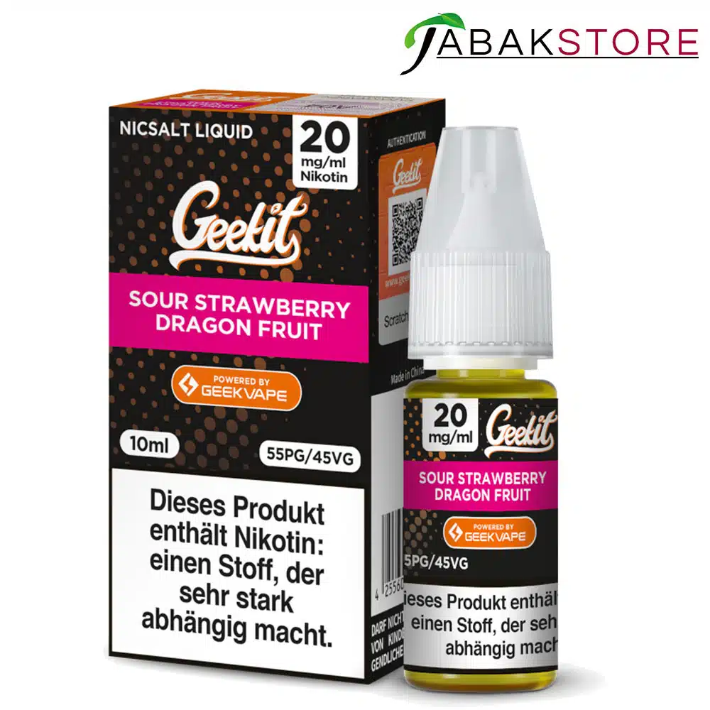 Die Geekit Sour Strawberry Dragon Fruit Liquids mit 20mg Nikotin vereinen intensive Fruchtaromen in einem handlichen 10ml Liquid.