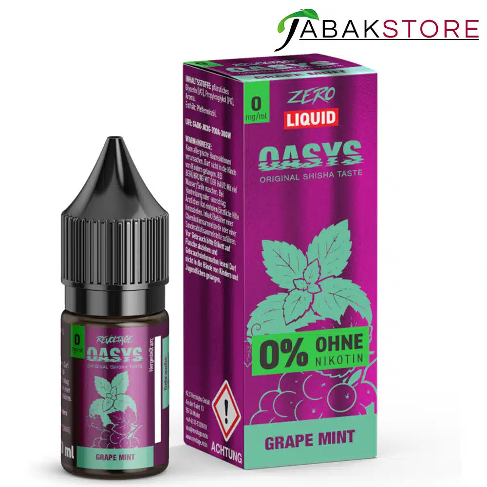 Die Revoltage Oasys Grape Mint Liquids mit 0mg Nikotin verwöhnen den Gaumen mit dem authentischen Genuss von fruchtigem Shisha Tabak.