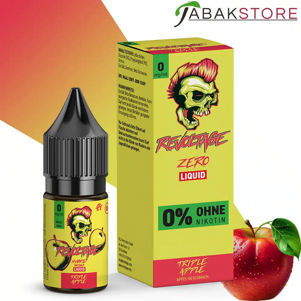 Die Triple Apple Aromen von Revoltage glänzen mit einem pfiffigen Design und 0mg Nikotin. Wer sich für Revoltage entscheidet, entscheidet sich dafür, eine Vielzahl an fruchtig süßen und aromatischen Geschmacksrichtungen zu entdecken. Im Mittelpunkt steht dabei nicht nur ein köstliches Aroma, sondern auch ein qualitativ hochwertiges Liquid, das ein angenehmes und sicheres Dampferlebnis bietet. Um diesen Anforderungen gerecht zu werden, setzt Revoltage auf reine Inhaltsstoffe von Premiumqualität.